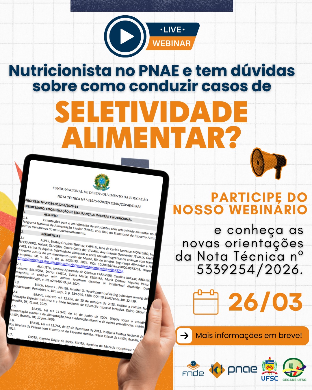 Webinário: “Atendimento a Estudantes com Seletividade Alimentar no PNAE – Inovações da Nota Técnica nº 5339254/2026”.