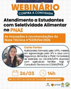 O CECANE UFSC convida para o Webinário: “Atendimento a Estudantes com Seletividade Alimentar no PNAE – Inovações da Nota Técnica nº 5339254/2026”.